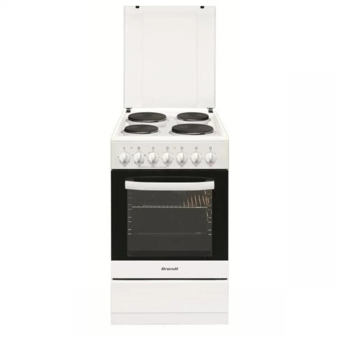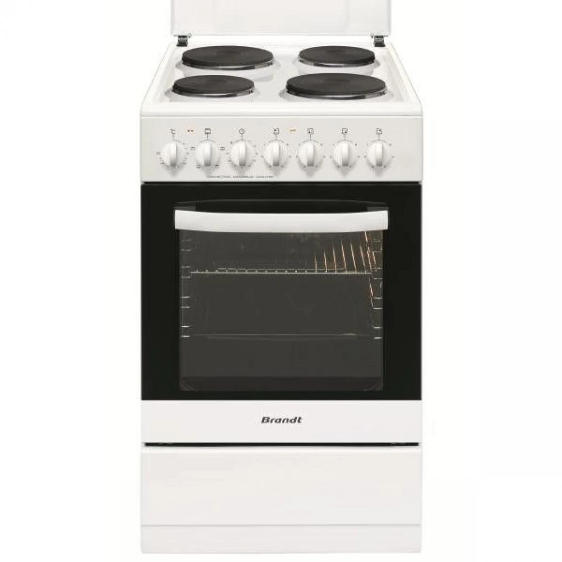 cuisinière électrique 52l 4 feux blanc – ke1500w – Cuisinière électrique BRANDT KE1500W.Nettoyage par catalyse.Toutes les graisses sont automatiquement éliminées pendant la cuisson.Espace de rangement.Il accueille tous les accessoires, même les ustensiles les plus encombrants.Les grilles sécurité anti-basculement.Conçues pour assurer une bonne stabilité à tous les types de plats de cuisson, elles peuvent s?avancer hors du four de la cuisinière jusqu?aux trois-quarts de leur longueur sans risquer de basculer. Ces grilles sont aussi très pratiques pour réaliser vos grillades en y déposant directement les viandes.Contre-porte plein verre.Elle se démonte en un tour de main pour faciliter le nettoyage.Un espace de rangement avec porte abattante.Votre cuisinière Brandt ne manque pas d’astuce! L’espace de rangement permet d?accueillir votre casserolerie inutilisée lors des cuissons comme le plat lèchefrite et vos ustensiles de cuisson comme les plats à gratin ou les moules à gâteaux.Le plat Lèchefrite.Avec son rebord incliné, il est idéal pour la cuisson des pâtisseries (choux à la crème, meringues, madeleines, pâtes feuilletées?). Inséré dans les gradins sous la grille, il recueille les jus et les graisses des grillades. – Type de produit : Cuisinière électrique.