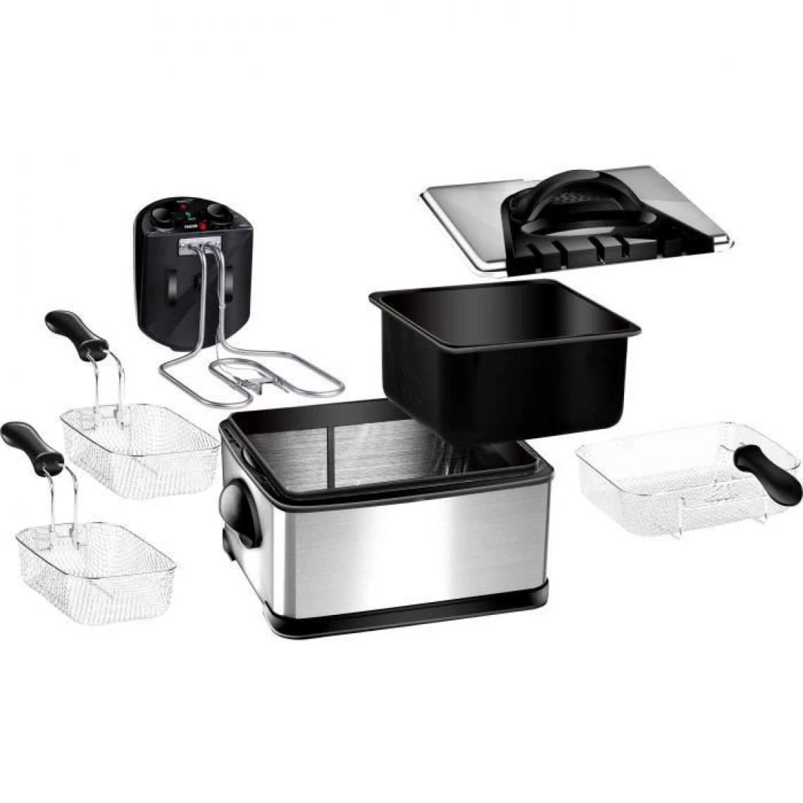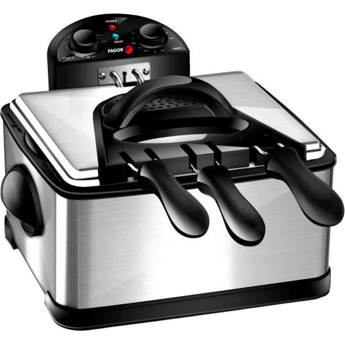 FAGOR FG124 Friteuse 3 Paniers -2000W – CapacitĂ© 4L- 1,8 Kg de frites – Corps en inox – 3 Paniers: 2 petits + 1 grand – Cuve amovible – Timer: 1h – Thermostat rĂ©glable – Range cordon -PoignĂ©e et parois cool-touch -Filtre carbone anti odeurs -Protection contre la surchauffe- Couvercle, cuve et panier lavables au lave-vaisselle .