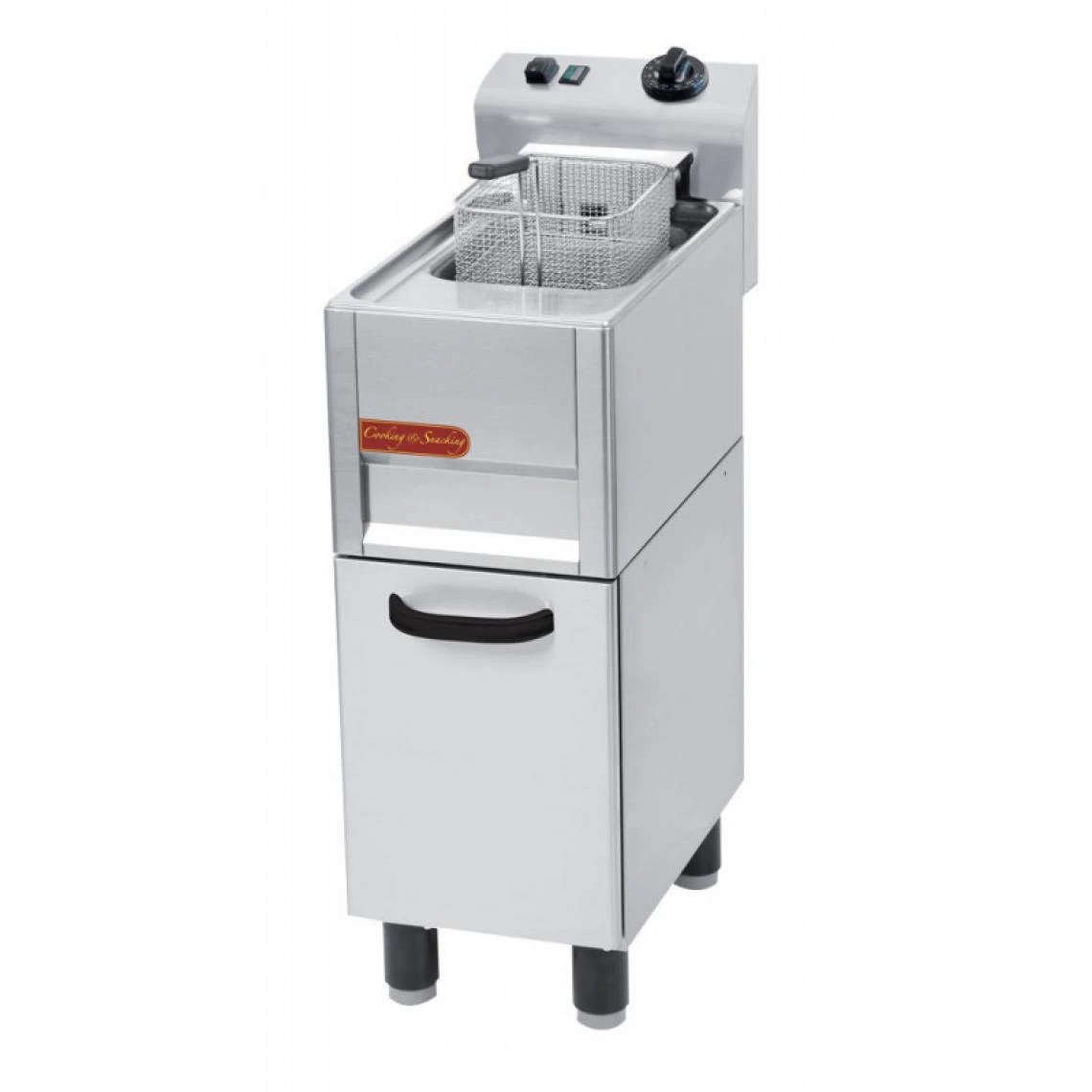 Friteuse électrique sur placard fermé comprenant un système de vidange incorporé. Cette friteuse professionnelle sur meuble est dotée d’une cuve d’une capacité de 9 litres. Thermostat de régulation jusqu’à 190°C Dimensions : L 330 x P 600 x H 900 mm Dimensions avec emballage : L 365 x P 675 x H 1090 mm Dotation : 1 panier (210 x 235 x 100 mm) | Poids : 28 kg Poids avec emballage : 33 kg Puissance : 6 kW Voltage : 400 V/3N