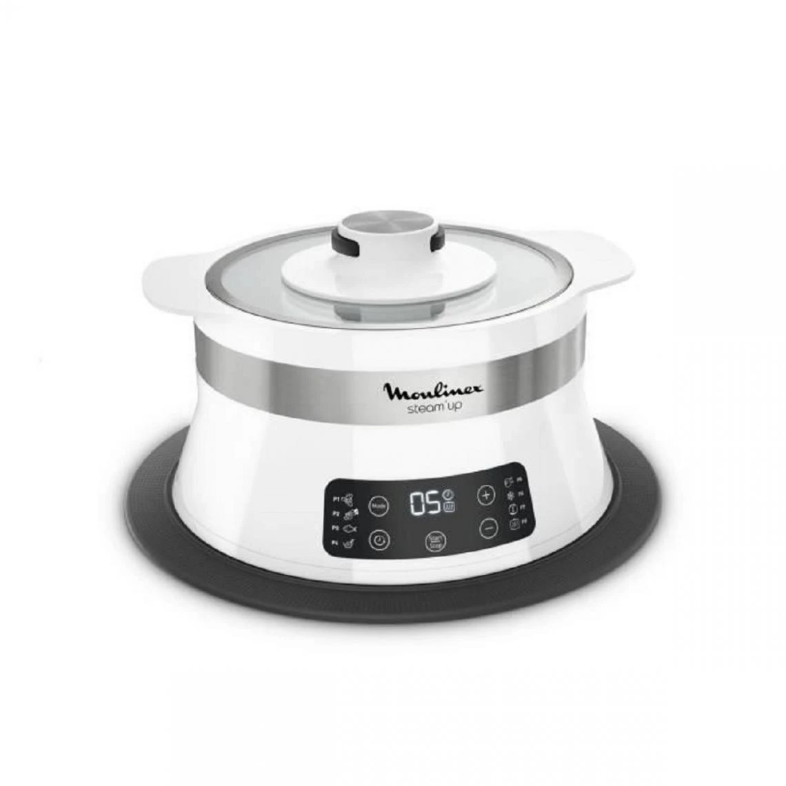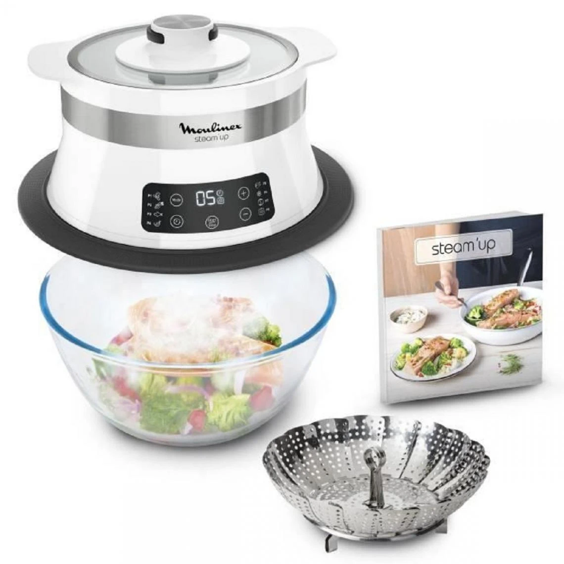 MOULINEX VJ504010 STEAM’UP Cuiseur Vapeur Gourmande – Recettes vapeur savoureuses et gourmandes – 8 programmes automatiques (poissons, lĂ©gumes, viandes, riz, dĂ©congĂ©lation, rĂ©chauffage et maintien au chaud) et mode manuel – S’adapte a tous les rĂ©cipients de 16 a 28 cm de diametre – Ultra compact : sans nettoyage car aucun contact avec les aliments – Livre de recettes + 100 recettes disponibles en ligne
