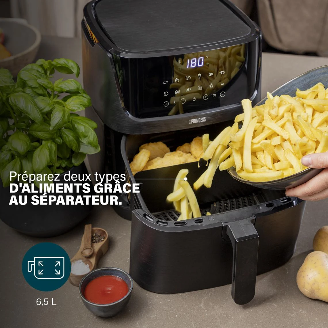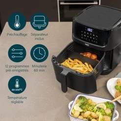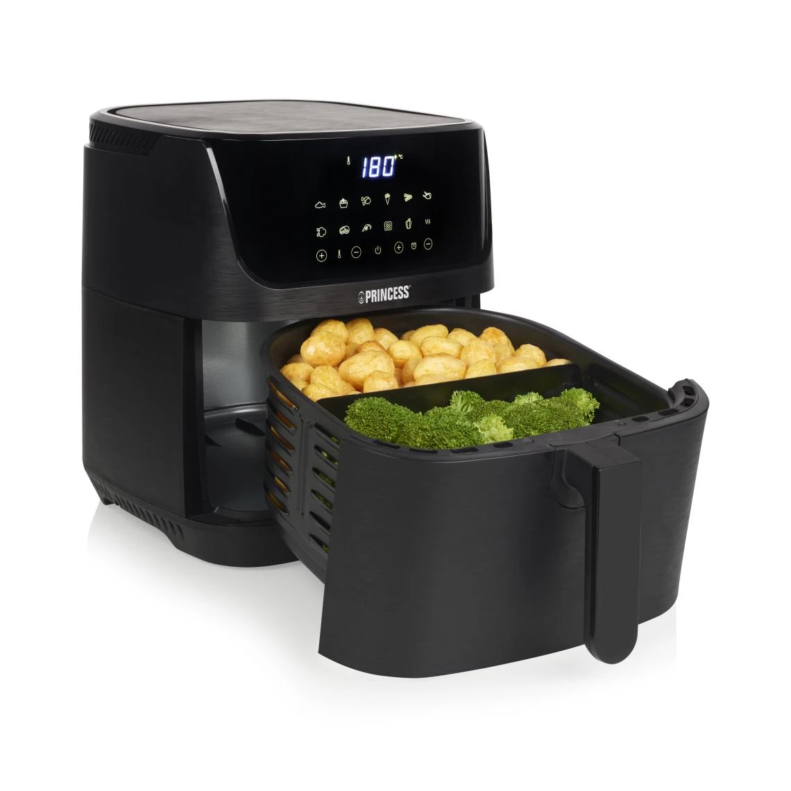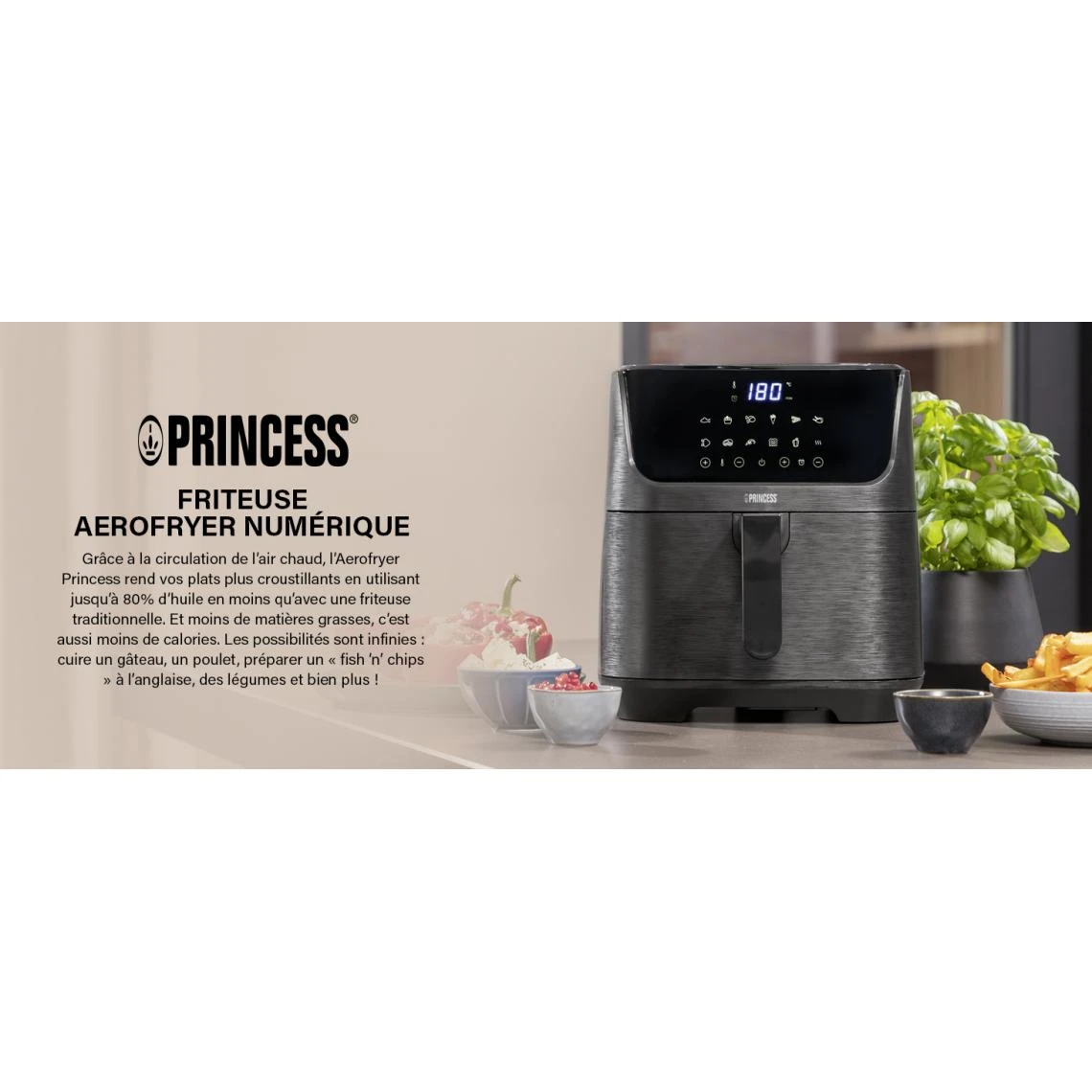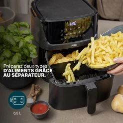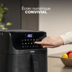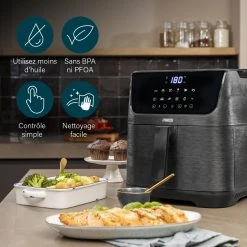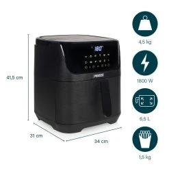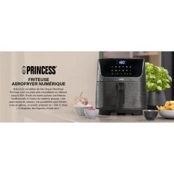Princess 01.182061.01.001 Friteuse – Digital Aerofryer. Type de produit: Friteuse d’air chaud, CapacitĂ©: 6,5 L, CapacitĂ© de la friteuse: 1,5 kg. Type de construction: Unique, Couleur du produit: Noir, Type de commande: Tactile. Type d’Ă©cran: LCD. Puissance: 1800 W, Tension d’entrĂ©e AC: 240 V, FrĂ©quence d’entrĂ©e AC: 50 / 60 Hz. Largeur: 340 mm, Profondeur: 310 mm, Hauteur: 415 mm