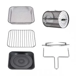 De plus, elle inclut 6 accessoires : panier en file, cage cylindrique, plateau pizza, grille pour griller, pince Ă griller, fourchettes et broche Ă griller.
