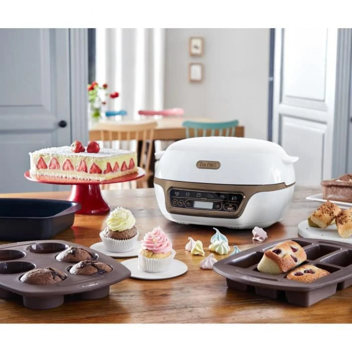 machine Ă gâteaux 1100w blanc/marron – kd802112 – Vos gâteaux parfaitement rĂ©ussis, quand vous voulez et ou vous voulez, avec le KD802112 de TĂ©fal, le CAKE FACTORY + Machine Intelligente Ă gâteaux. Ne râtez plus vos gâteaux, avec Cake Factory+, c’est la garantie de plus de gourmandise et d’un rĂ©sultat parfait de toutes vos pâtisseries : maxi cookies, maxi brookies, brownies, fondants, cannelĂ©s, meringues, muffins, cupcakes, madeleines… tout devient possible ! Avec Cake factory, vous pouvez mĂŞme faire cuire votre pain Ă la maison ! Une cuisson parfaite grâce Ă ses 5 programmes automatiques intelligents qui contrĂ´lent avec prĂ©cision le temps de cuisson et les variations de tempĂ©rature. Profitez aussi du mode manuel, pour plus de libertĂ© ! Fini de tâtonner en cuisine. Cake Factory+ contient tout ce dont vous avez besoin pour vous lancer : trois moulesTefal ProFlex (Fonte de chocolat + 6 muffins + 6 mini cakes) plus un moule en aluminium antiadhĂ©sif inclus. Des centaines de recettes disponibles : un livre de 20 recettes inclus dans le pack et retrouvez plus de 500 recettes dans l’application mobile pour ne jamais ĂŞtre Ă cours d’idĂ©es. – Type de produit : Machine Ă gâteaux.